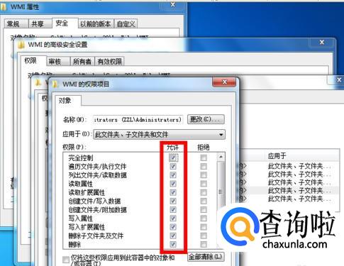 在进入你的账号对WMI文件夹控制选项中,将完全控制下方的所有选项全部勾选,如下图所示,然后点击【确定】按钮。