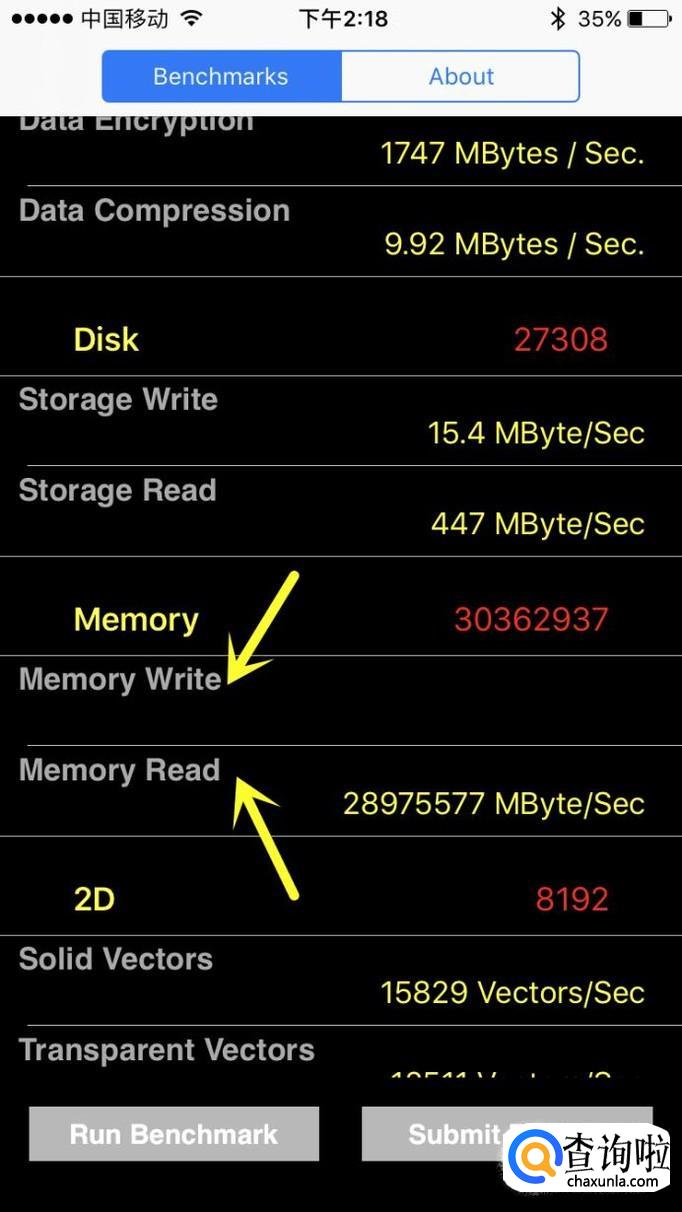 然后测试完成后我们就可以看到手机闪存读写速度了。(memonry write为写出速度,memory read为读取速度)