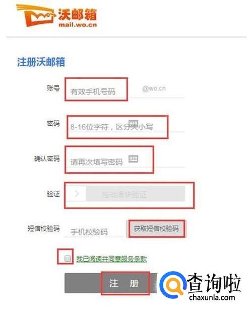 在注册沃邮箱页面,输入有效的联通手机号,然后按照要求进行填写,最后点击“注册”