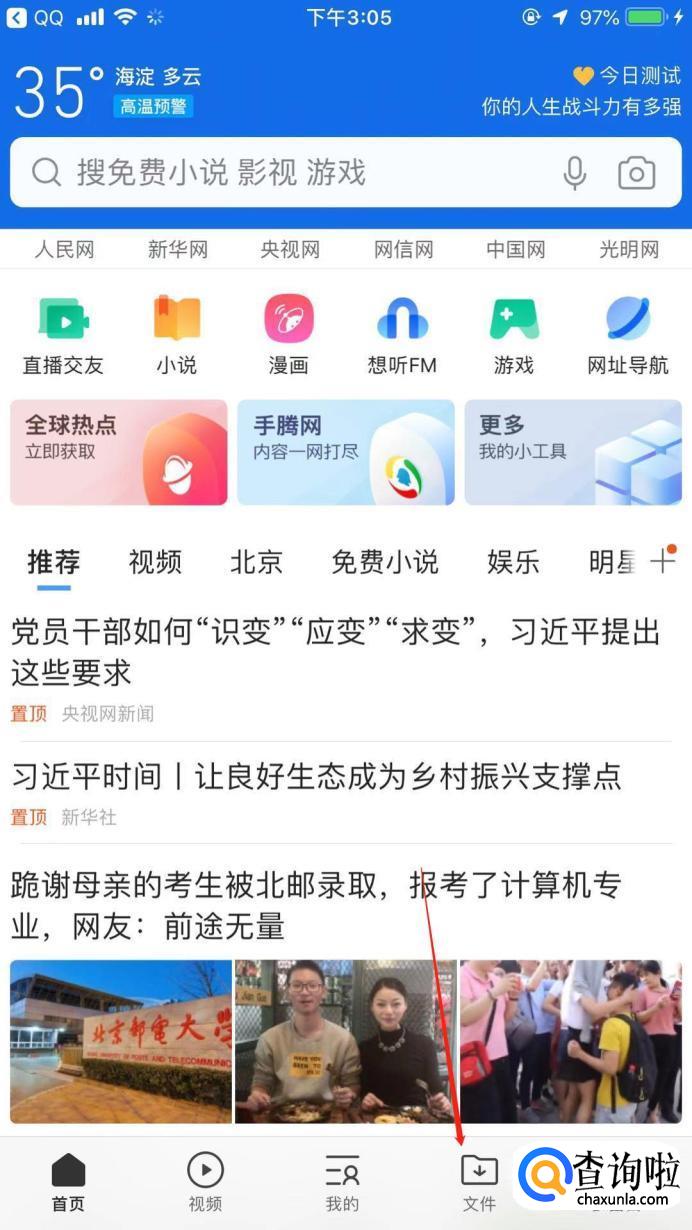 首先,打开“QQ浏览器”,进入首页后,点击下面的“文件”选项。