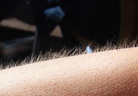人感到冷或者害怕的时候,身体上自然而然会生出鸡皮疙瘩。鸡皮疙瘩的学名叫毛发直立(piloerection)。每个体毛根部的微小肌肉结合在一起,看起来就像人体上生出的一个个小疙瘩。在很久很久以前人类还拥有天然“皮大衣”的时候,鸡皮疙瘩就具有实际意义。毛发变蓬松后,毛发之间的空气相当于一层绝缘体,给身体保温。竖起毛发对食肉动物或敌人来说是一种威胁,猫咪面对一只狗就会躬身竖毛。进化使人类的毛发变得越来越稀疏。