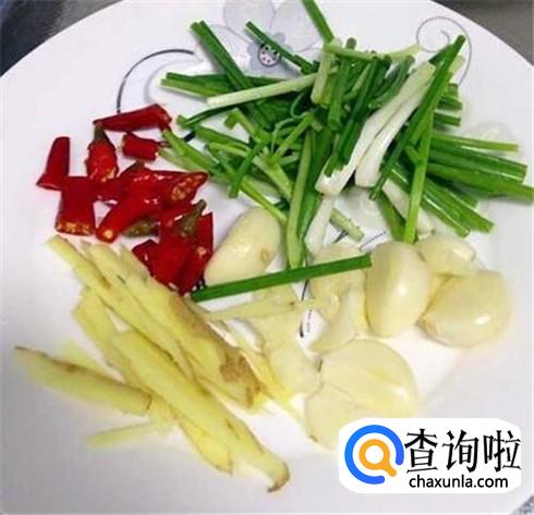 准备好适量的姜葱蒜辣椒,姜切成姜丝,葱切断,蒜头切片,辣椒切碎。