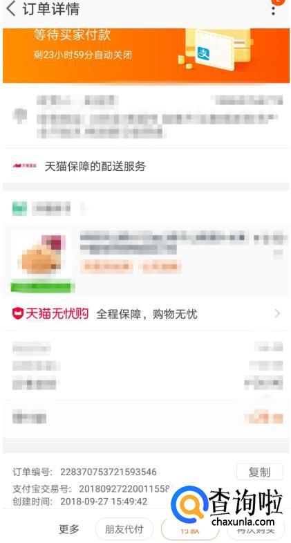 点击提交订单,进入付款页面、再返回,订单就没有付款成功,然后进入淘宝订单详情界面,如图。