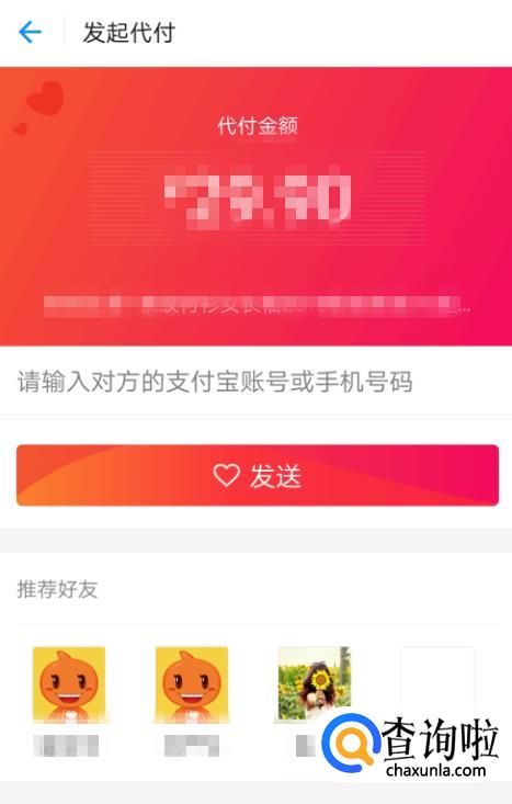 点击朋友代付,进入发起代付界面,输入好友的支付宝账户或手机号码。