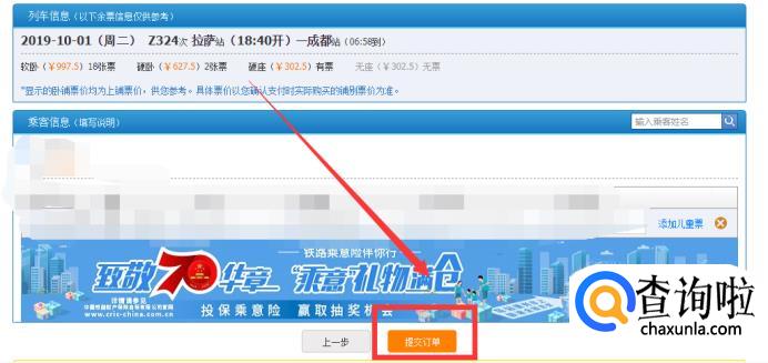 然后找到自己所需要的列车班次,有票的情况下直接购买,核对好自己的个人乘车信息,点击下方的【提交订单】。