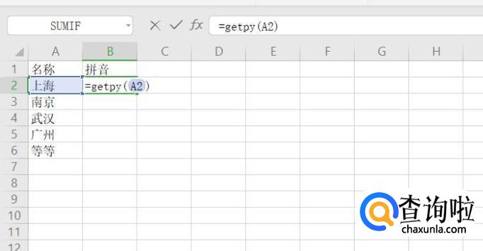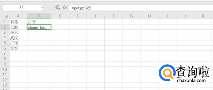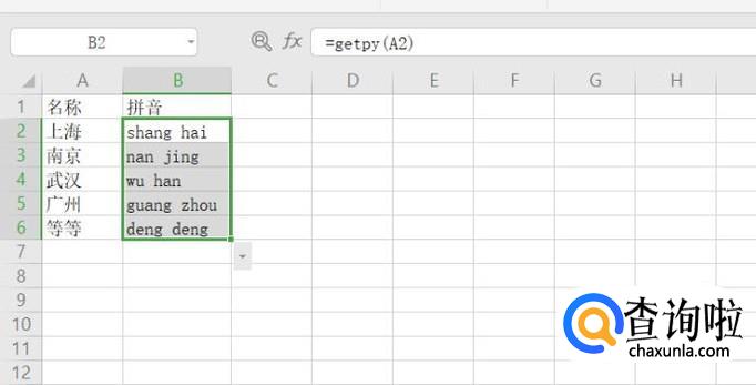 在B2单元格中输入=getpy(A2)并回车,就转化成了拼音了