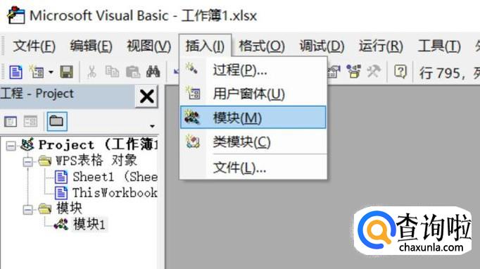 快捷键alt+f11,调出宏设置页面,选择插入中的模块选项