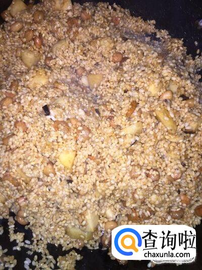 将糯米沥干水分,下入锅里,加入适量的蚝油、老抽、盐、鸡精,翻炒均匀;炒到色泽均匀就可以了;