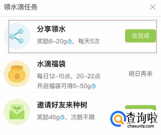 分享领水滴。这是很基本的操作,也是很多人最容易实现浇水的方法,只要分享给好友,就能获得8到20的水滴,非常方便。