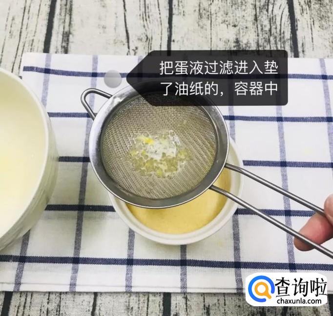 接着把蛋液过滤进放着油纸的容器中,如下图所示。