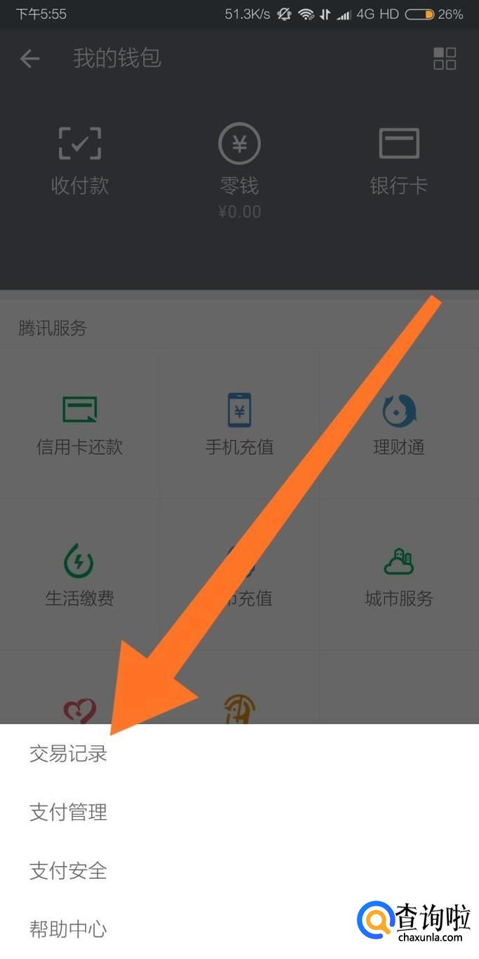 接着在弹出的菜单栏中选择“交易记录”,点击进入。