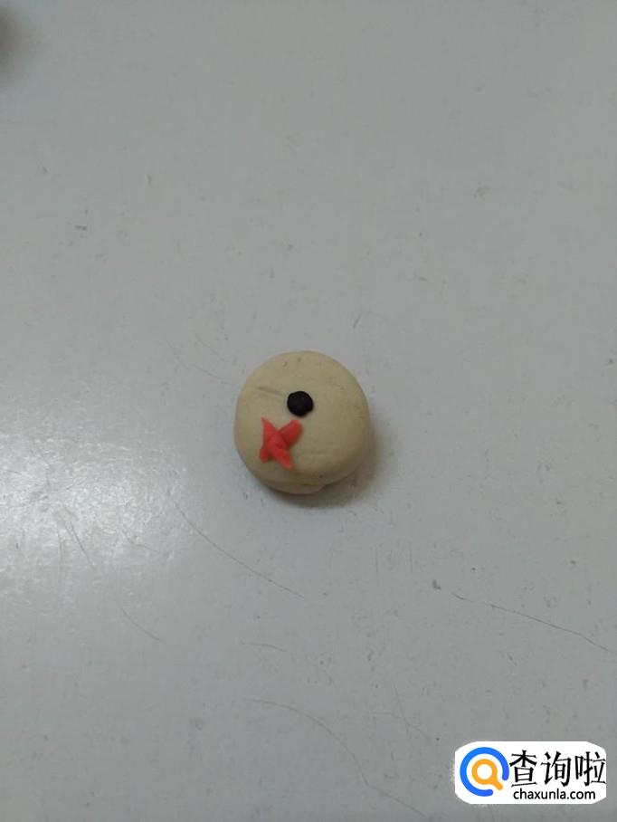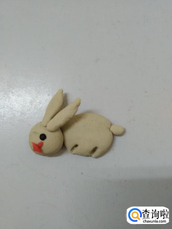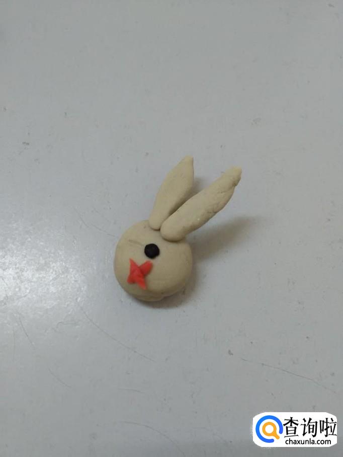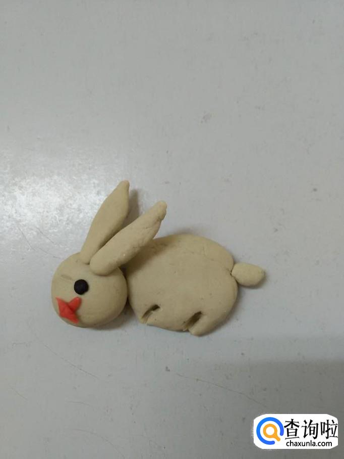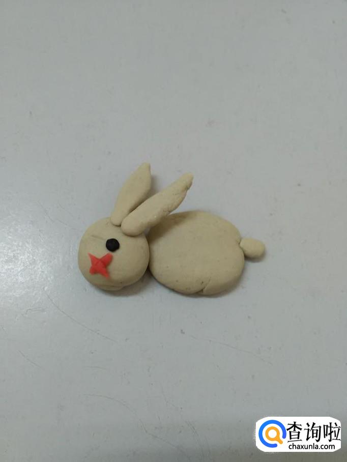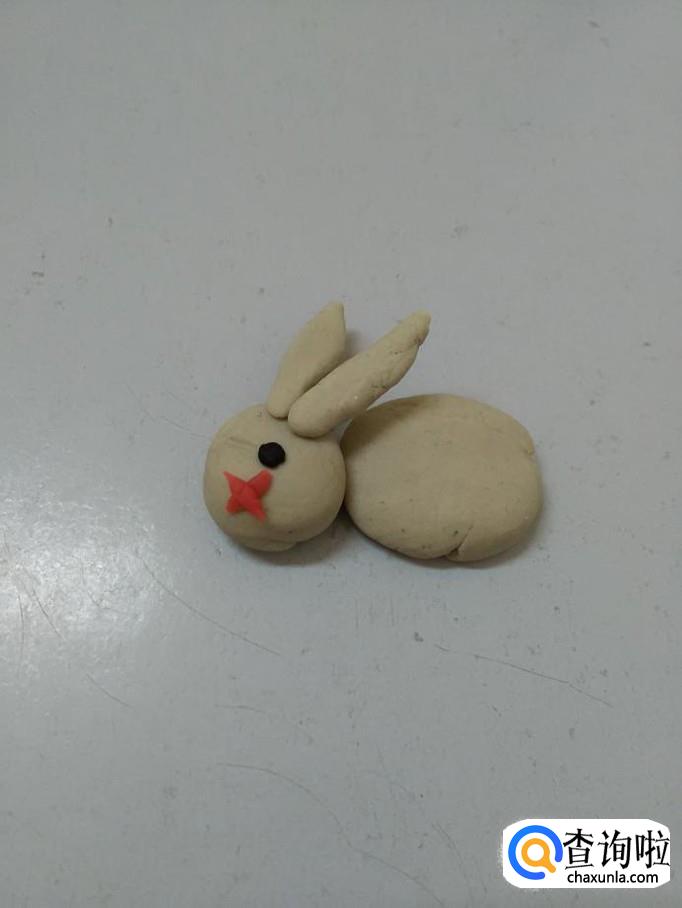 用红色搓一个小条,分成两段,十字交叉粘好,粘在小白兔的眼睛下面,当做小白兔的嘴。
