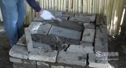 沿着底砖继续码放砖头,上面水泥的量要适当减少,因为成灶还要在外围抹水泥。