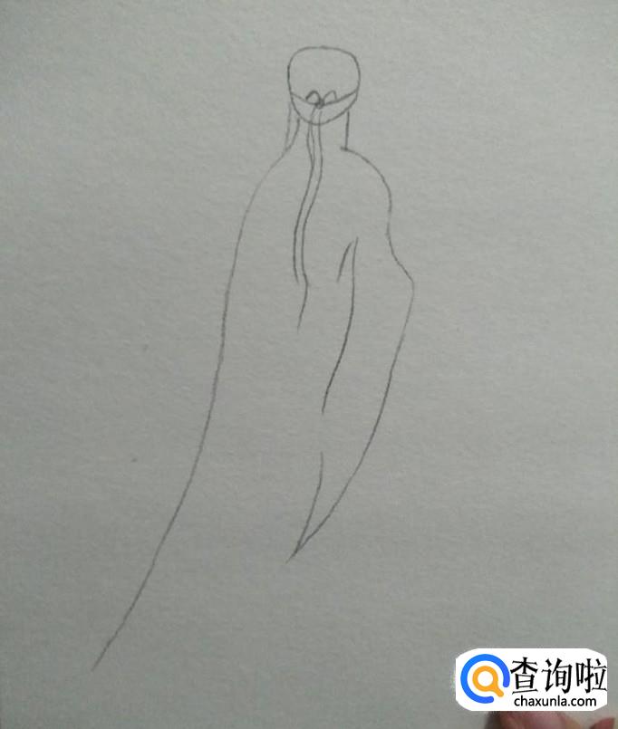 如下图一所示,画出肩膀部分与左侧的衣摆,然后用一根曲线画出右边的衣袖