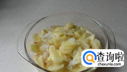 往盆中的姜片倒入大量的盐,搅拌一遍,姜片都能沾到盐,腌制3个小时左右。