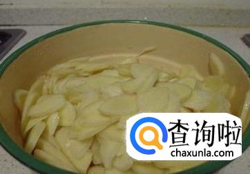 将生姜皮去除,然后用清水洗净,再切成薄片,装入一个盆中。