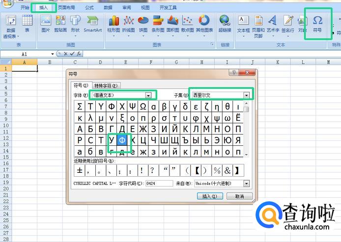 选择符号字体为普通文本,子集为西里尔文,在符号列表中找到φ。