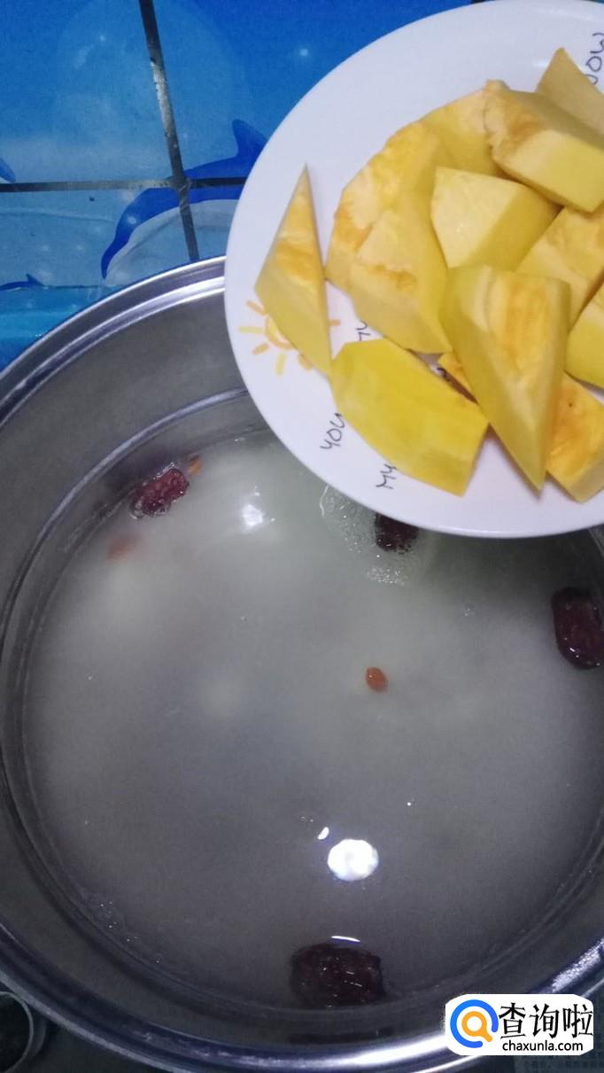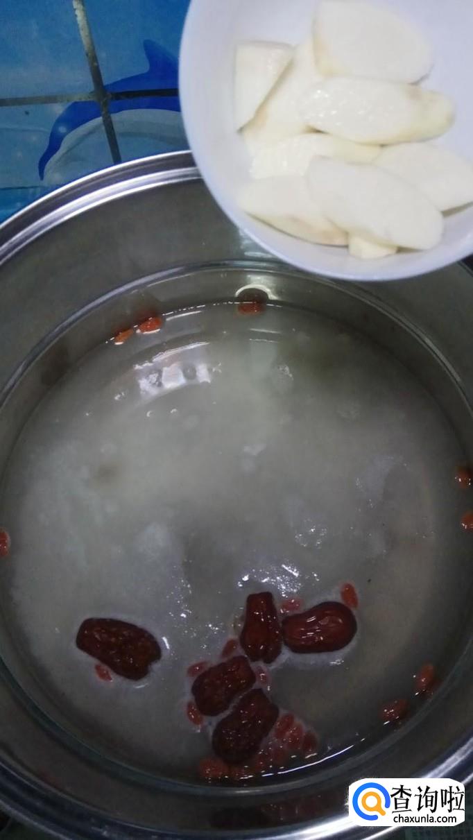 将准备好的山药块也倒入锅中,经过熬煮的山药,药效会更大。