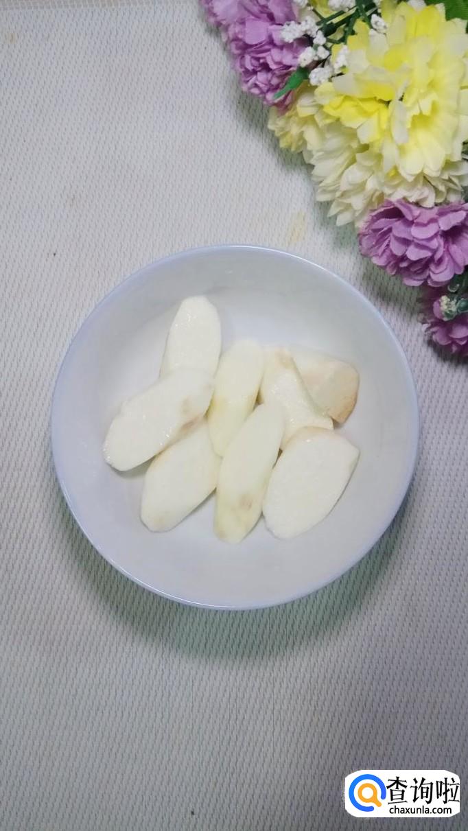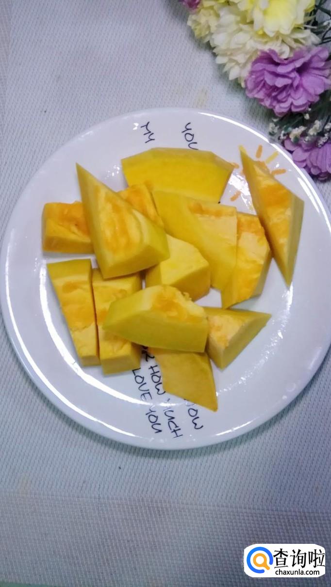 带上一次性的手套,将铁棍山药去皮后切成片儿备用;将南瓜去除外皮,切成块,放入盘中备用。