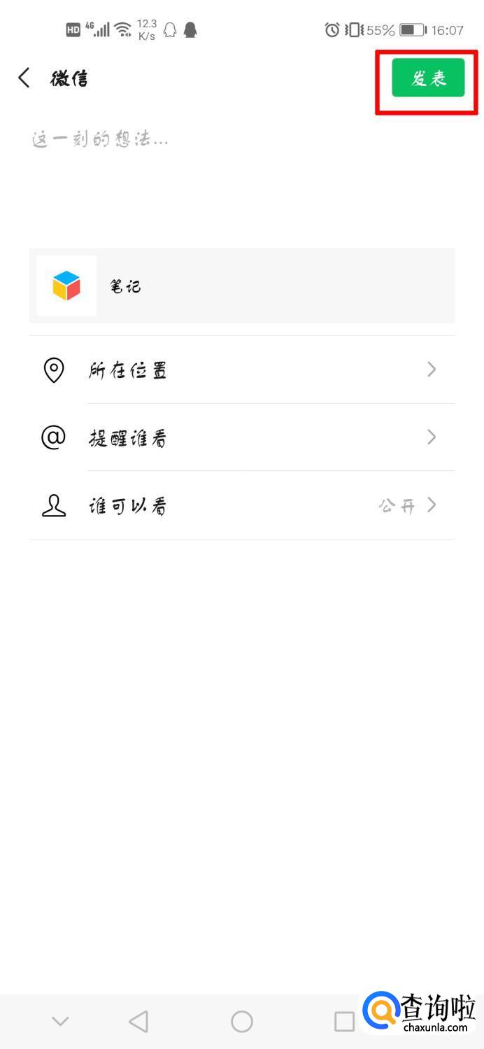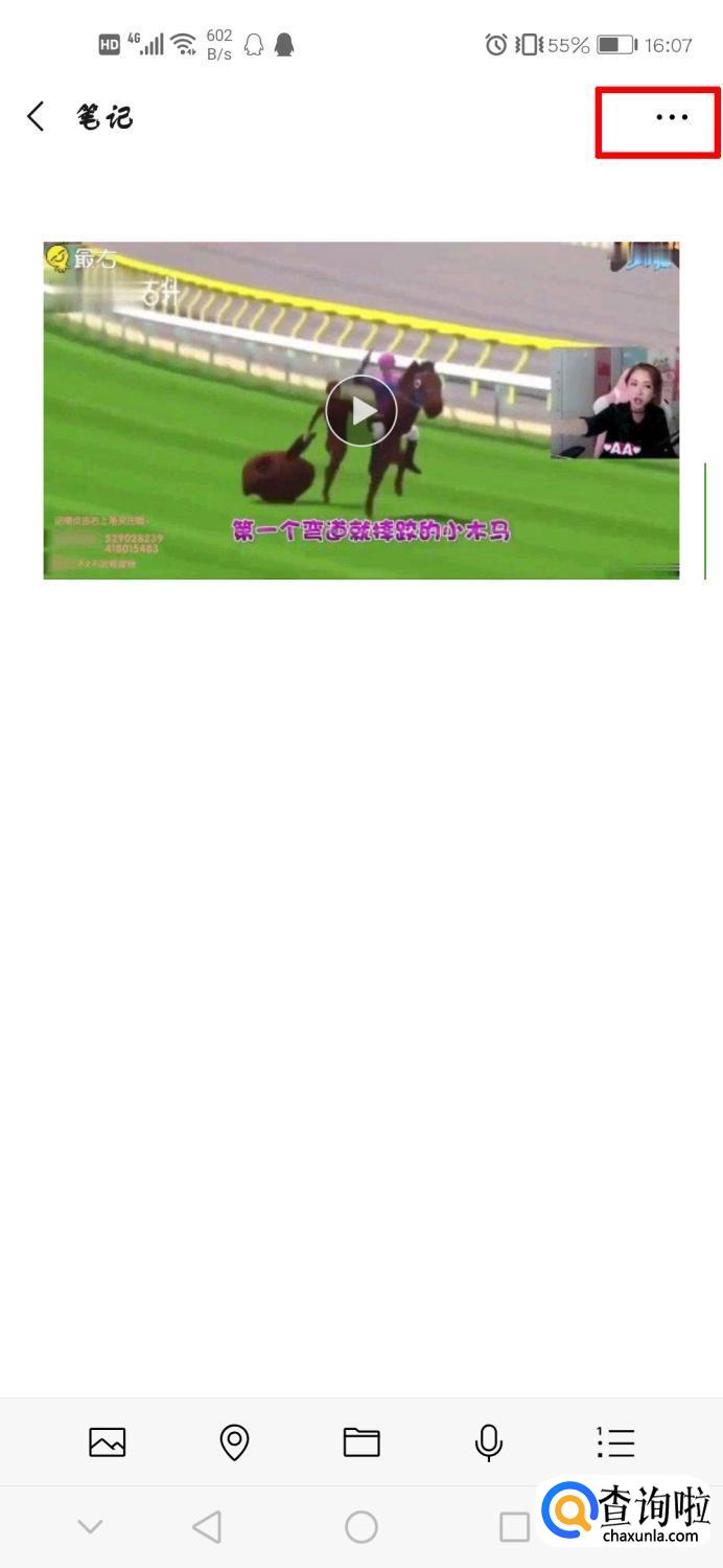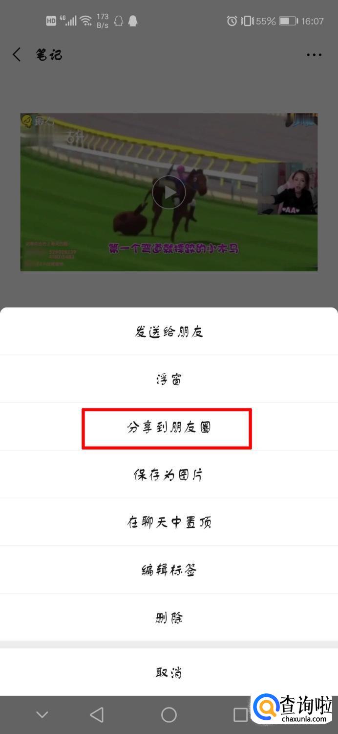 返回笔记页面,点击右上角的三个小点,选择“分享到朋友圈”命令。
