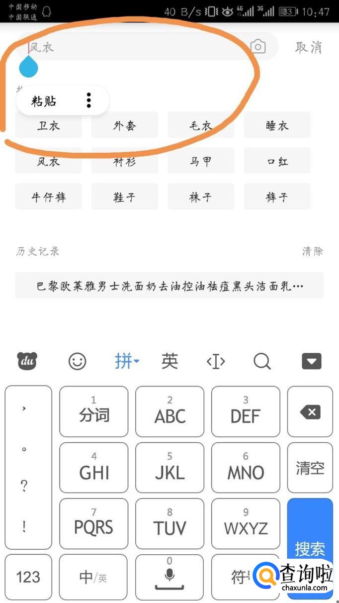 长按上方的搜索栏,出现“粘贴”的提示之后点击