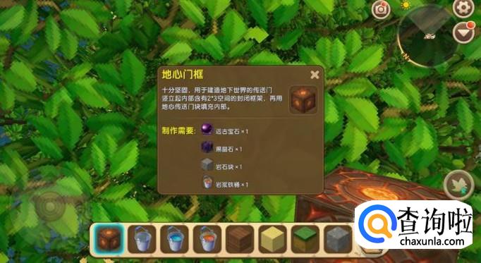 地心门框是由远古宝石、黑晶石、岩石块和岩浆铁桶这四种物品制作而成的,因此我们需要分别获取这四种物品。