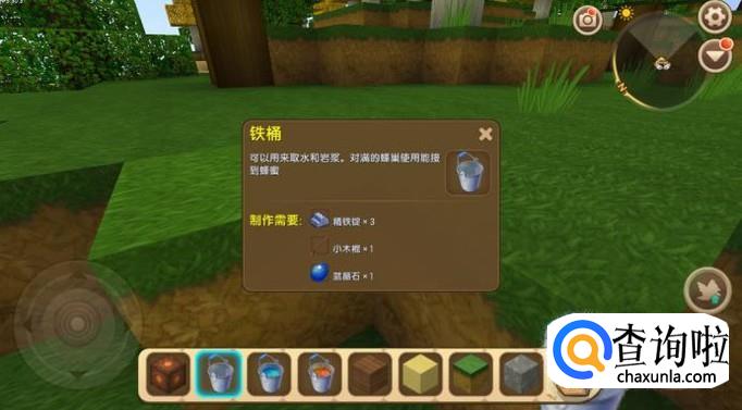 首先我们需要只做一个铁桶,由精铁锭、小木棍和蓝晶石制作而成。我们可以多制作几个铁桶,以后能用到。