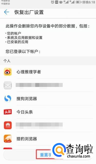 弹出的界面,我们点击重置手机就可以了,之后就会进行恢复出厂设置了。