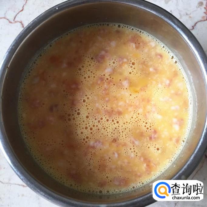 将蛋液倒入肉末里,再加入少量的淀粉,搅拌均匀,备用;