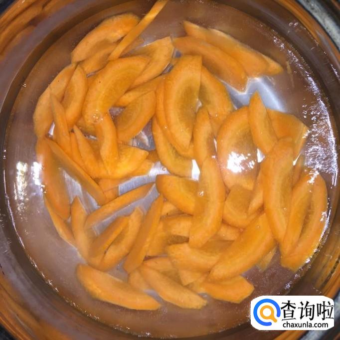 锅里烧开一锅水,将胡萝卜下入锅里,煮到八九分熟后捞出,沥干水分;