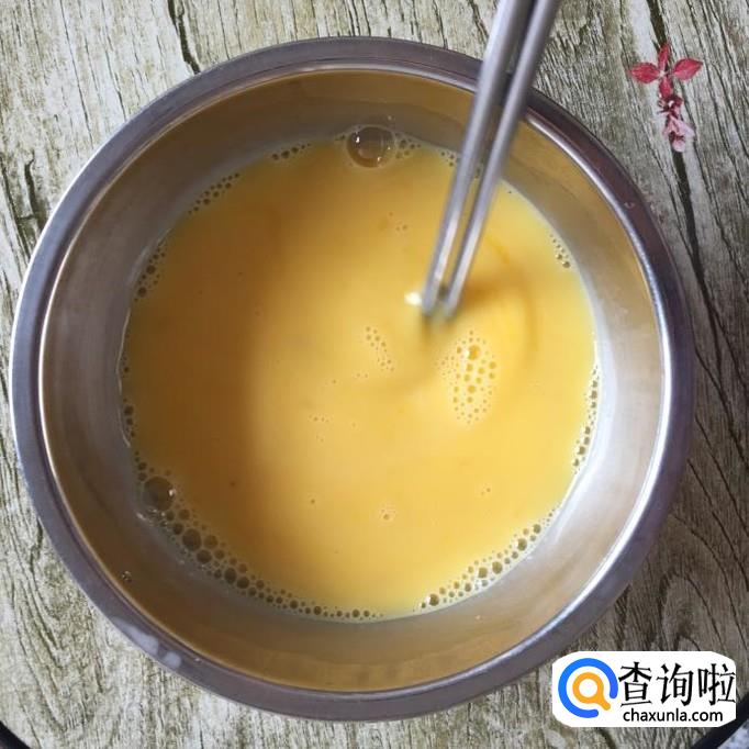 取2-3个鸡蛋,将鸡蛋打入碗里,加入少量水,打匀备用;