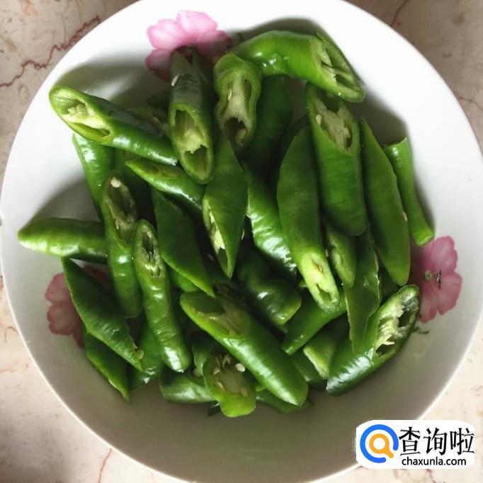 取2-3根尖椒,将尖椒的蒂去掉、尾去掉,洗净,斜刀切成小段;