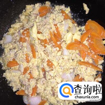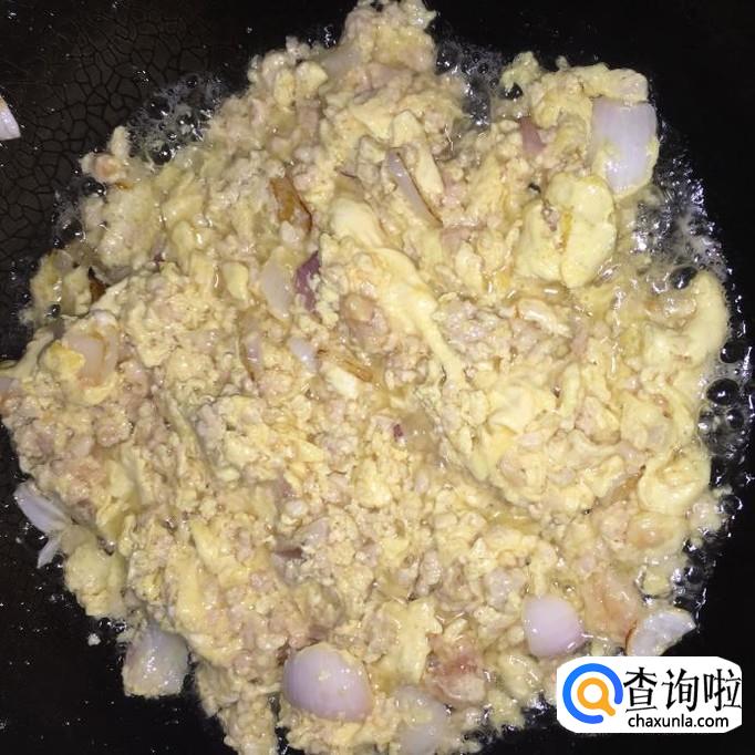 将鸡蛋肉末全部倒入锅里,翻炒至肉色变白、鸡蛋凝结;
