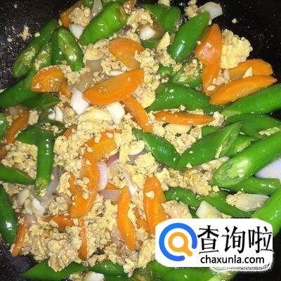 将胡萝卜和尖椒下入锅里,翻炒均匀;