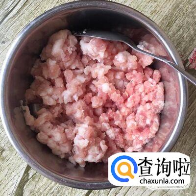 取100g左右肉末,放入碗里,加入少量料酒,拌匀,腌制十五分钟,备用;