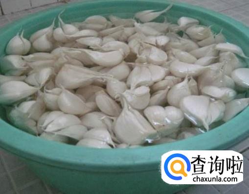 将大蒜泡在盆中,再放上盐,搅拌均匀,腌制一个晚上,让蒜入味。