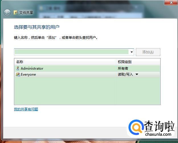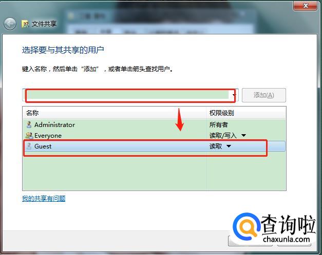 点击页面中间共享按钮,打开共享用户选择窗口,可以看到guest用户并没有在已经添加过的用户名称里面。