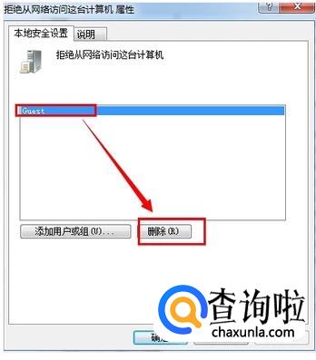 还可以在右边看到“拒绝从网络访问此计算机”,点击并打开,把其中的guest用户删除就可以了,如图所示。
