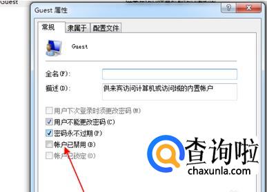 一般情况下,就会发现guest用户被禁用了。那么需要开启guest用户的权限。如图所示。在“用户已禁用”前面打上对勾。