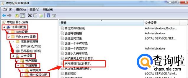 点开本地策略以后,可以在右边看到“从网络访问此计算机”,点击并打开,然后把guest 用户添加进去。