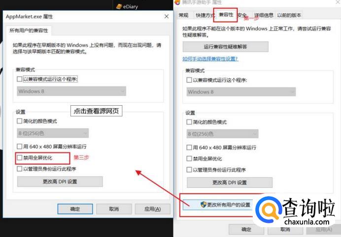 右击点击要执行的文件,右击选择属性,接着在兼容性中找到更改所有用户的设置,点开后找到禁用全屏优化,选中后点击应用。