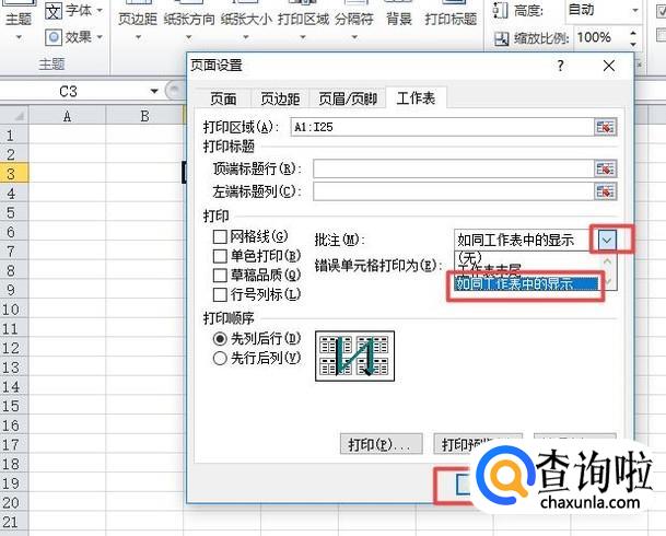 弹出的界面,我们点击批注边上的下拉箭头,然后选择如同工作表中显示,然后我们点击确定;