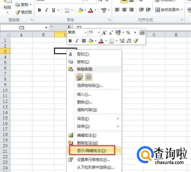 然后我们右击有批注的单元格,弹出的界面,我们点击显示/隐藏批注;