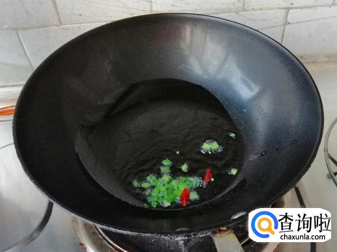 适量青葱,用清水洗净,放在菜板上,切成葱末待用,干红辣椒一个,用清水洗净,切好待用。