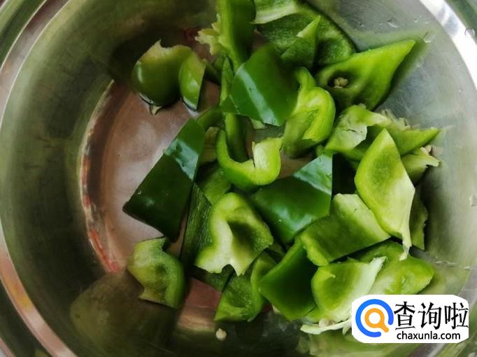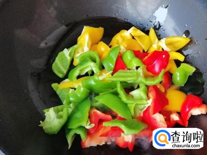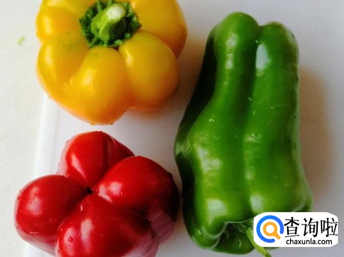 选用新鲜的青椒、红色、黄色彩椒各一个,先用清水把三色彩椒洗净,最好用盐水泡一会,去掉农药残留,最后再冲洗一遍去掉菜椒把。