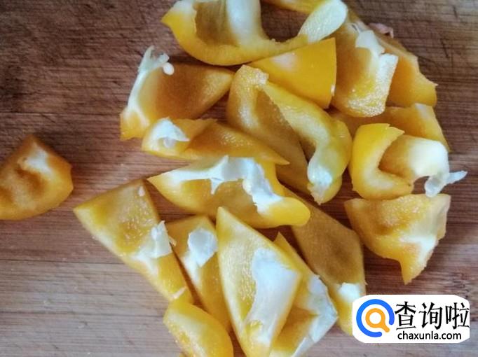 把三色菜椒分别去把去籽,然后放在菜板上,用刀切成滚刀块状,三色彩椒都切好后,放入容器中待用。