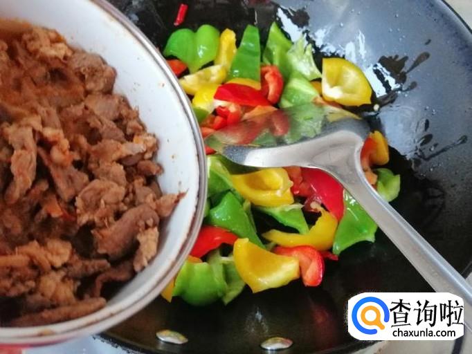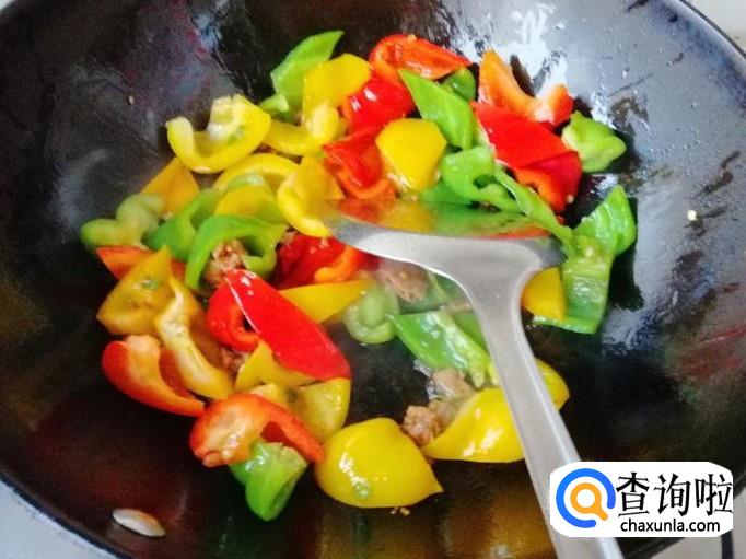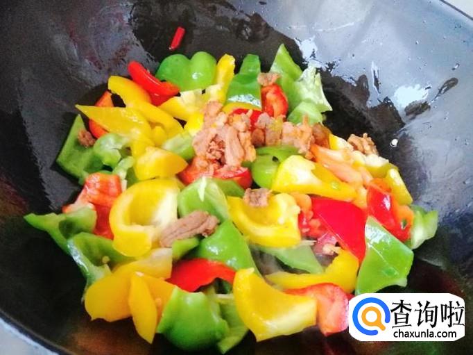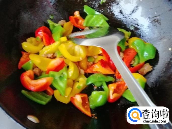 彩椒不要炒过了,断生就可以加入适量熟猪肉,然后用铲子继续翻炒,让肉和彩椒在锅中充分受热。