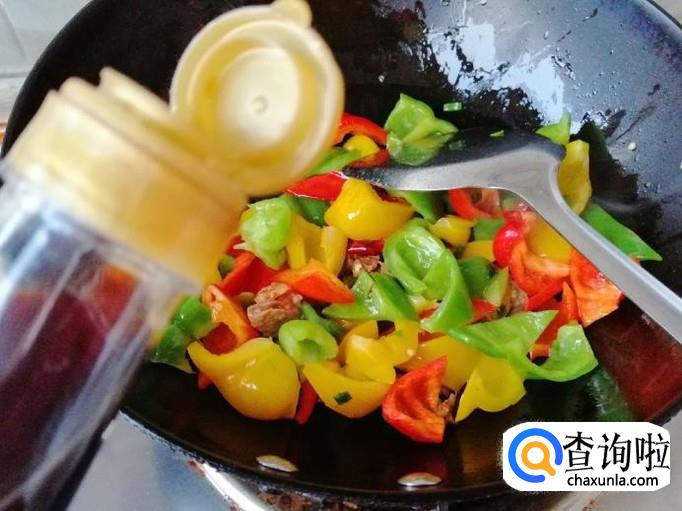 如图所示,加入适量生抽,把彩椒炒肉翻炒均匀,这样美味的彩椒炒肉就做好了,注意不要把彩椒炒面了,容易造成营养流失。
