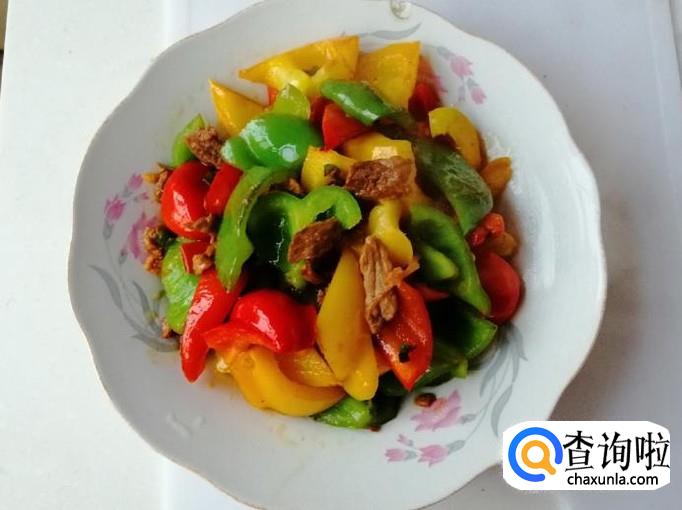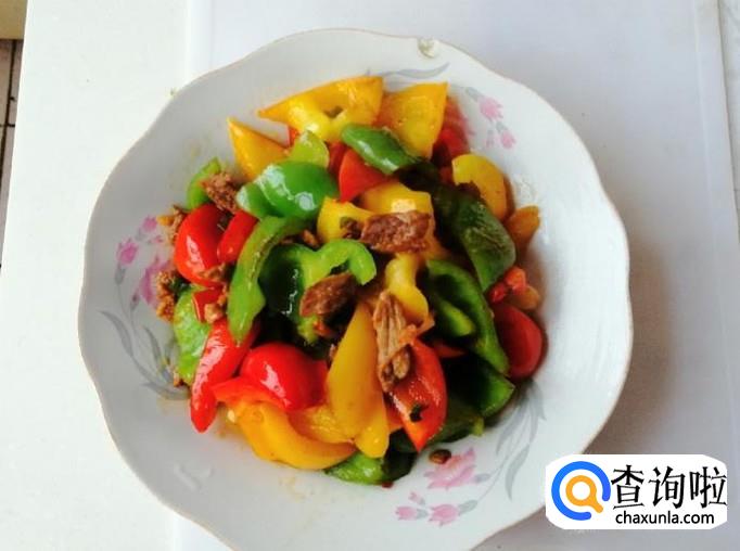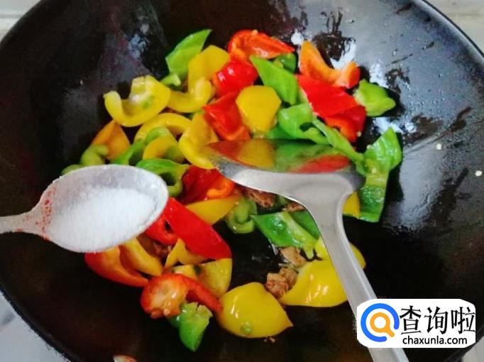关火加入适量食盐,用铲子把美味的彩椒炒肉,翻炒均匀就可以出锅入盘,色香味俱全的彩椒炒肉,会让人食欲大增,赶紧上桌开吃。