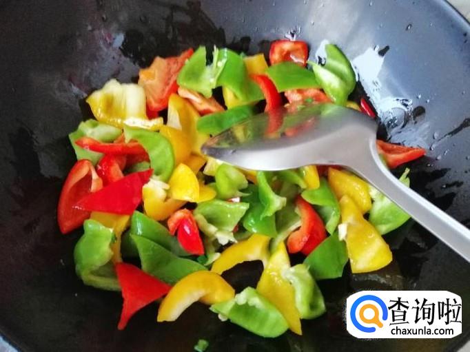 炒锅放油,油热后放入备好的葱和辣椒,炒出香味后放入切好的彩椒,用铲子把彩椒快速翻炒均匀。